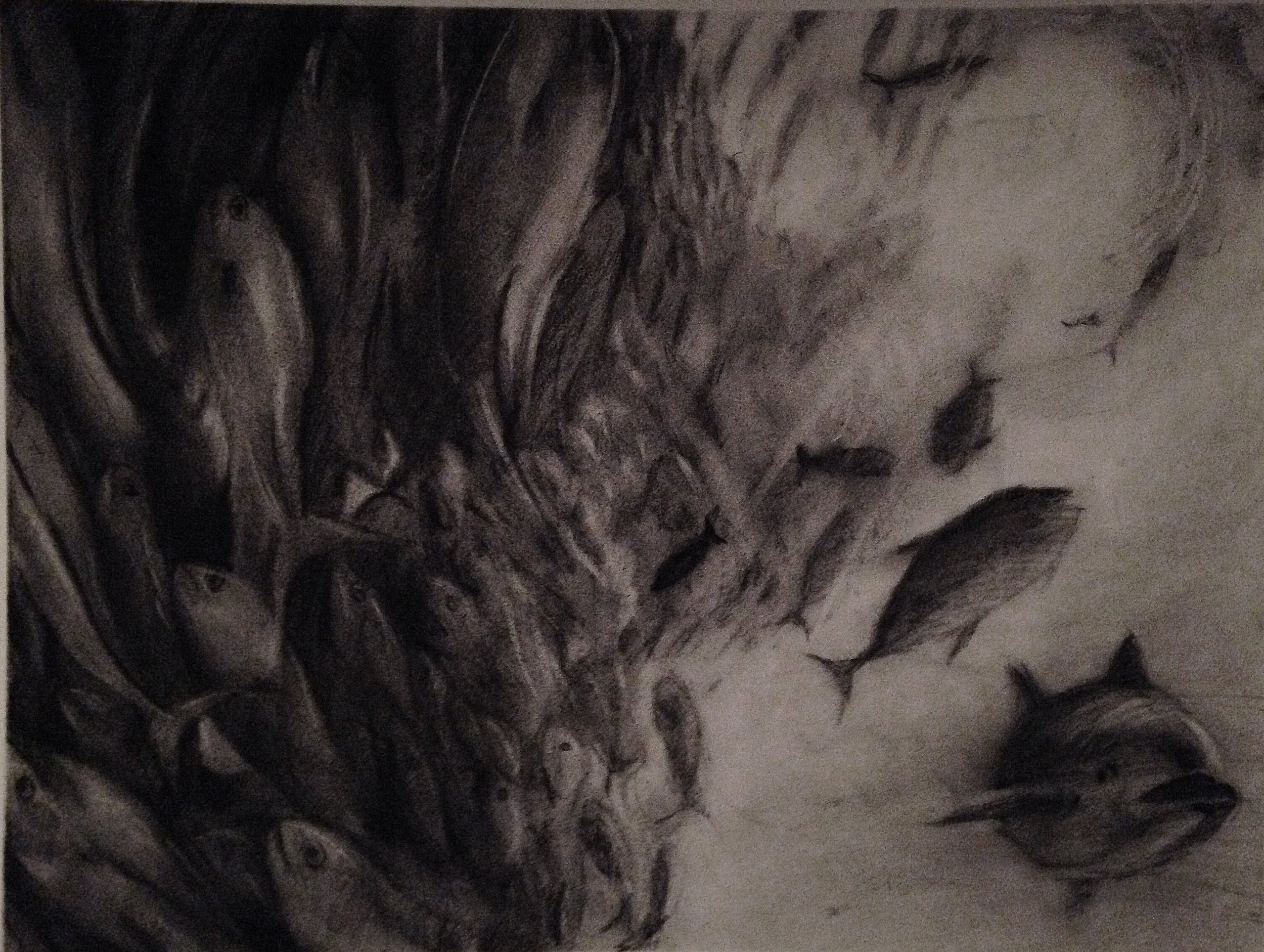 School of Fish, drawing while watching Planet Earth, charcoal on paper. 2014
